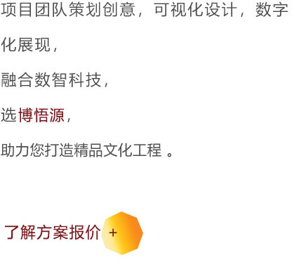 苏州博悟源文化科技有限公司,深耕行业十余年,以“文化+科技”为发展原点,立足文化、科技、创意三大主线,跨界融合创新,聚焦在新基建、城市更新、文旅融合、城市文化中心、文化科创园、特色小镇,乡村振兴、大数据、教字演艺、大遗址公园、创新科技应用研究开发,目前已成为从文化内容策划、大展览、智慧科技研发到施工落地的一站式文旅项目综合服务商。